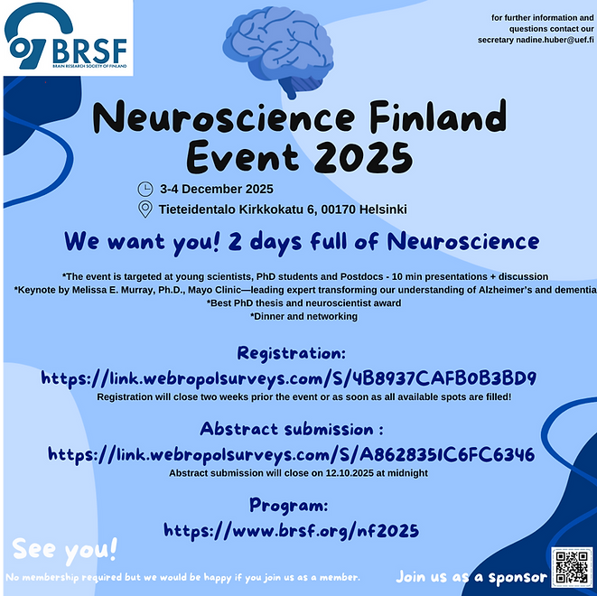 The Brain Research Society of Finland is excited to invite you to Neuroscience Finland! The event will be organized on December 3.- 4., 2025 in Helsinki.